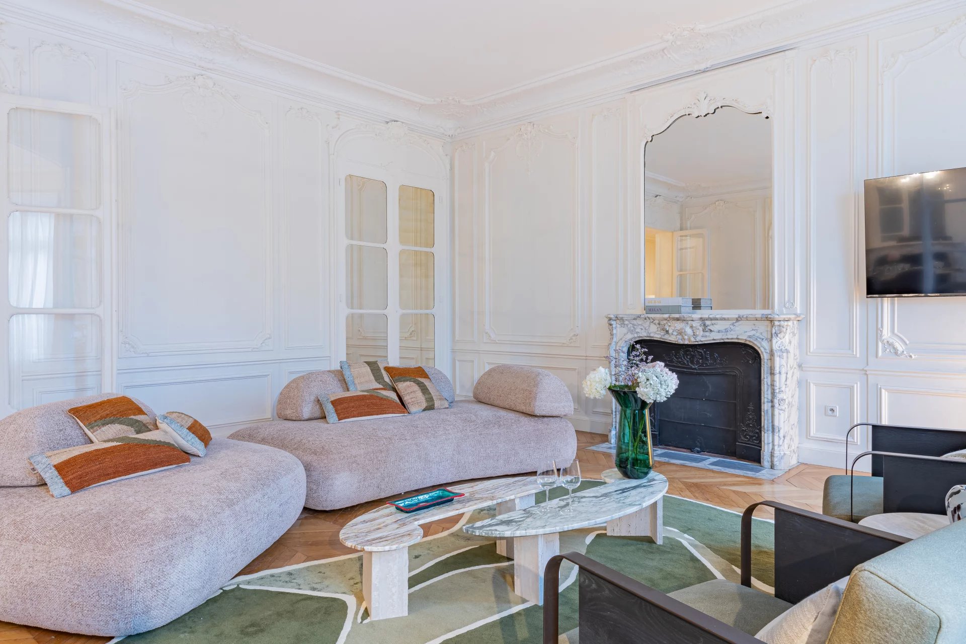 Séjour lumineux avec cheminée en marbre et moulures