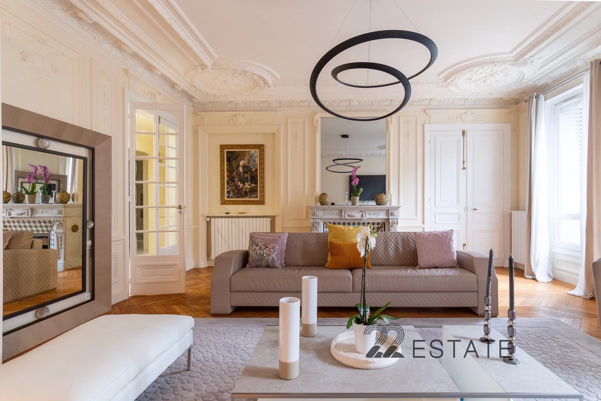 Un appartement d'une surface de 250m2 situé au 3éme étage d'un immeuble Haussmannien, qui se compose : d'une entrée, un double séjour doté de trés belles moulures d'époque et sa cheminée en marbre d'origine, une salle à manger séparée, une trés belle cuisine chêne et marbre noir totalement équipée, 4 chambres avec deux salles d'eau, une suite parentale avec dressing et salle de bain, des WC invités. Ce bien d'exception offre une magnifique vue sur l'Arc de Triomphe et la Tour Eiffel depuis son balcon filant.